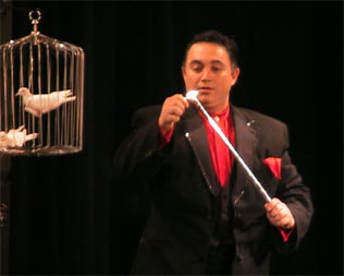 | (L) Danny Alan hypnotizing his dove. (R) "Nothing up my sleeves..." |