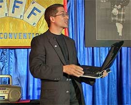 (L) Pat finishing with a traditional load. (R) From Helsinki, Robert Jagerhorn performs his FISM act.