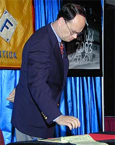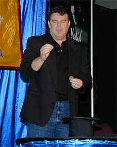 | Master magician John Carney opened with his version of Zone Zero. (R) John performs a very cool coins to hat routine. |