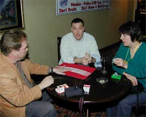 | Tony Econ demos his riffle shuffle stacking for Dave Solomon. |