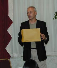 | (L) Convention organizer John Luka gets the ball rolling (R) Hired gun Bob King smokes the group. |