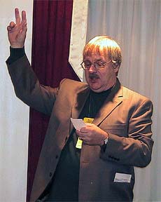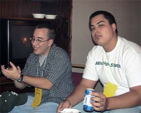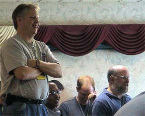 | (L) Marshall Cyrlin studies up while Marv Long catches some zzzzzs... (R) Convention organizer, John Luka gets the ball rolling. |