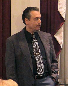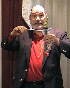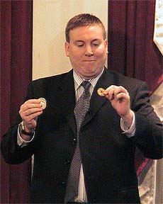 | (L) John Luka kicks off the show (R) IBM and SAM winner, Rick Merrill kicks some butt with mind bending magic. Where do those coins come from?? |