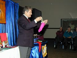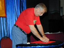 | It's becoming standard to have a teach a trick session. Roger taught a very cool control followed by Jennings' TNT. This was some "heavy work" indeed. Prof. REM (right) used an origami theme with a "hanging chad" for the trap door card. He also showed how to get a golf ball into a baby food jar. |