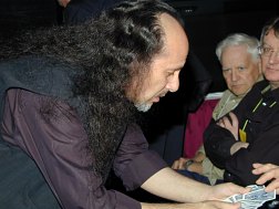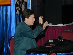 | Rocco continues by producing a whistle for Obie, a razor for Marc DeSouza and a Gandolf doll for Howie among other things. On right Sean Farquhar performed a highly impossible ambitious card routine. Ultimately a signed card is found inside a new box of cards - in position! Yipes. |