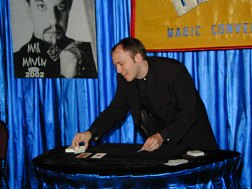 | Steve Duperre performed a cool sandwich routine ending with a card to wallet. On the right Jose Sousa executes a nice coins through table. |